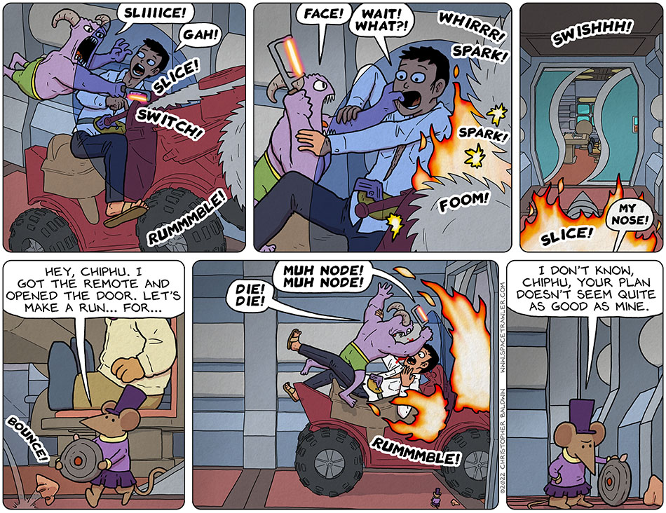 I gotta say, one thing I really do like seeing in my media is the heroes not being invulnerable. Scars, burns, long-term injuries, disfigurations. It makes dangerous situations actually feel dangerous, which is something Spacetrawler’s always done.