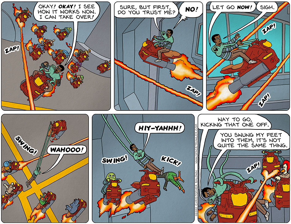 With a close-up in panel four, what I could only make out as “Large indigo beast” in the last strip is now obviously Space Shark!