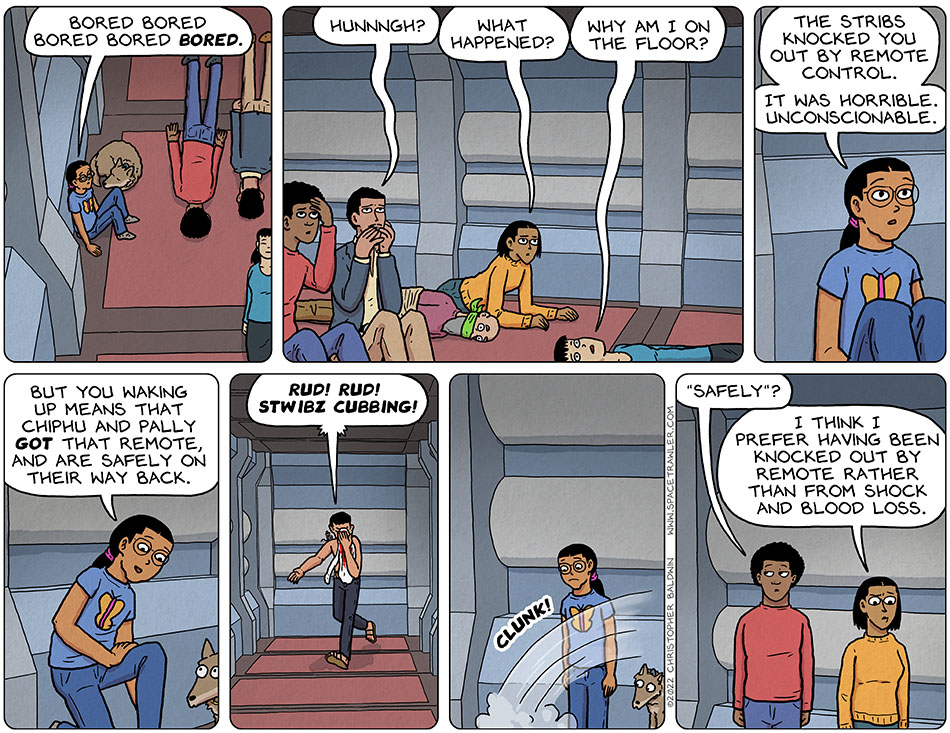 12/14/22 – Methods of Knocking Out Spacetrawler, audio version For the blind or visually impaired, December 14, 2022. https://www.baldwinpage.com/spacetrawler/wp-content/uploads/sites/15/2022/12/2022-12-14-spacetrawler3.mp3 Previous | Next 1st Series | 2nd Series | 3rd Series | First Strip Current Series | Archive | Most Recent Previous | Next 1st Series | 2nd Series | 3rd Series | First Strip Current Series | Archive | Most Recent Getting the band back together. 🙂 First Strip First Series | First Strip Second Series | First Strip Current Series| Archive | Most Recent 12/12/22 – Gestures of Caring 12/16/22 – Avoiding Coordination 7 Comments Efogoto December 14, 2022 at 1:33 am 3 years ago Now I know why Stangor and Aitana get along so well. They are members of the bored. Coyoty December 14, 2022 at 1:39 am 3 years ago Why are you all standing around?! Rud! The Stwibz are cubbing! KQY61 December 14, 2022 at 6:54 am 3 years ago Hi, Someone needs a band aid dispenser which says Blood! on it…. Dr. Moosen McMoose, Chief Spymooster of the Moosad December 14, 2022 at 6:20 pm 3 years ago “Why am I on the floor?” You’re about to walk the dinosaur. Night-Gaunt December 14, 2022 at 11:39 pm 3 years ago What happened? Have you answered that before? What happened? I feel like a looped tape. Efogoto December 15, 2022 at 1:13 am 3 years ago Mouse count: 0-0-0-0-1-0-0 minando December 17, 2022 at 6:51 am 3 years ago Strangely, in the language of Beta Minor 5 this translates as ‘Wait! Wait! The ice cream truck is coming!’. Leave a Reply Cancel reply Your email address will not be published. Required fields are marked *CommentName* Email* Website Notify me of follow-up comments by email. Notify me of new posts by email.