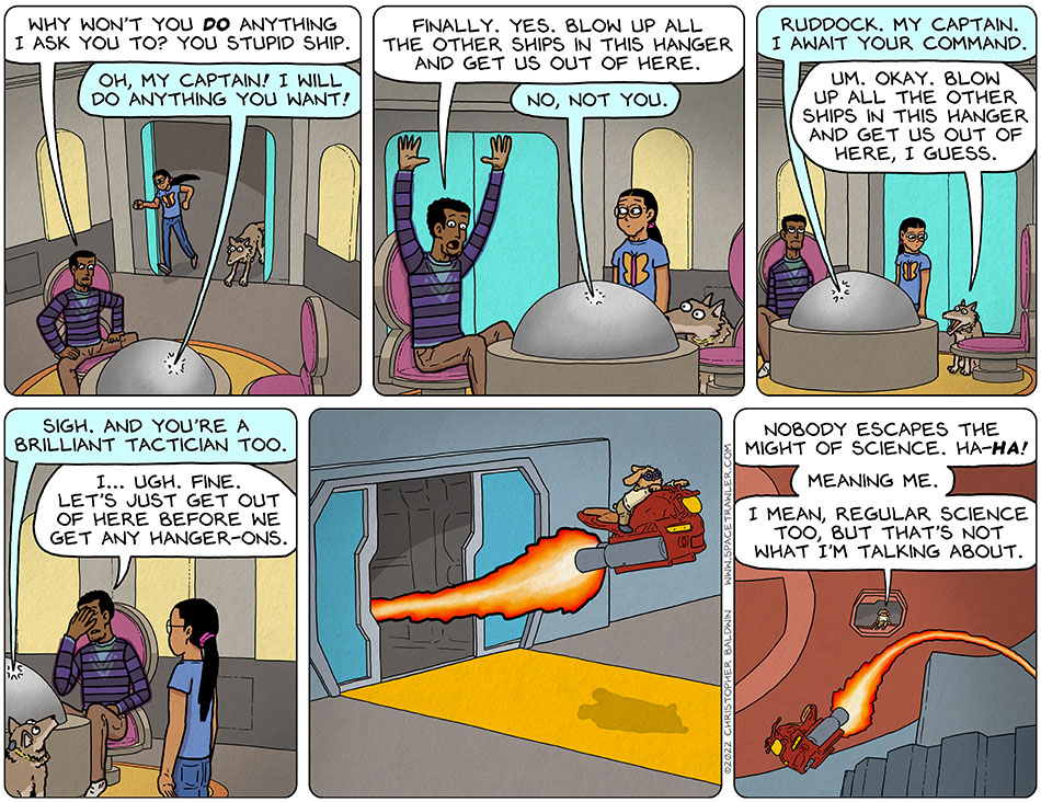 Lucky they’re all on the same ship they came in on, that’s responsive to Ruddock’s will. Which makes me realize that Science and Ruddock are the two beings with the greatest knowledge of the ship and its capabilities. This causes me both amused bemusement and some concern. What’s Science got in mind here? He hasn’t got his army of aliens behind him. He’s got something else in mind. But what?