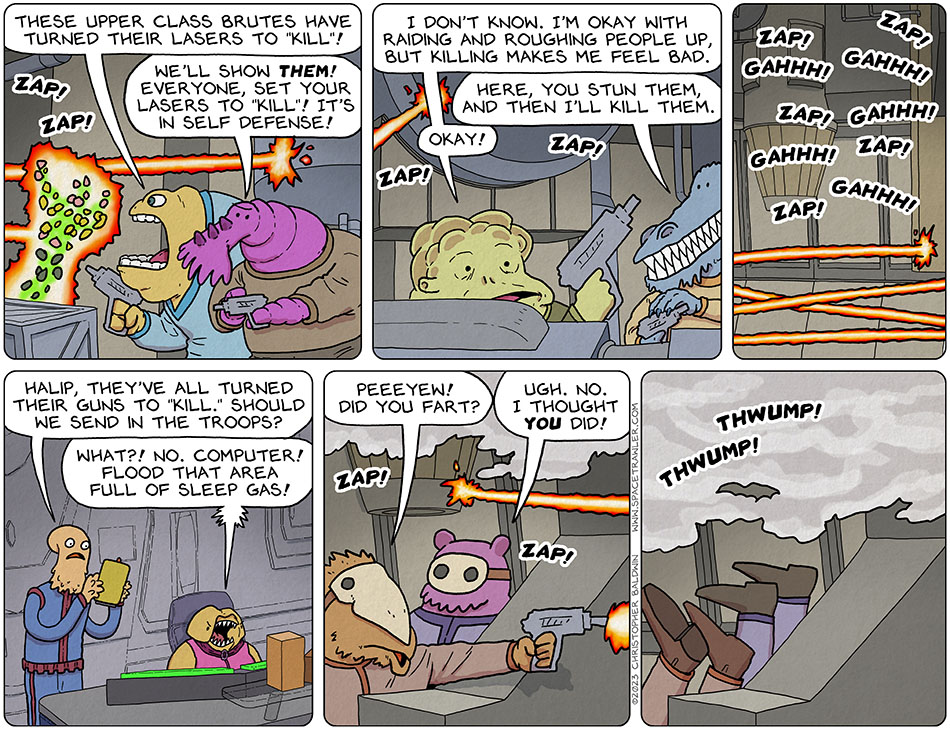 Ah, sleep gas. Makes the combatants easier to disarm, but harder to put into containment — whether that’s cells or storage bins doesn’t matter at this point.