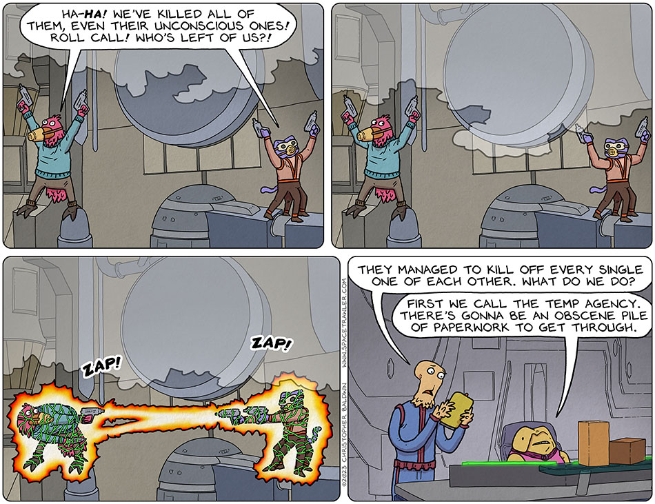 It is obvious that their zap-guns are made by different gun factories. In the third panel, the gun used by the avian alien to the left seems to resist the ZAP from his opponent. Nice detail!