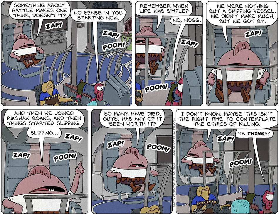 Something’s SERIOUSLY wrong with Nogg if fighting makes him philosophical. Offhand I can’t think of a faster way to snuff it than to contemplate the purpose of life while somebody else is trying to end yours as swiftly as possible. If it wasn’t for Gurf and Krep (especially Krep!) Nogg would have been nigiri long ago.
