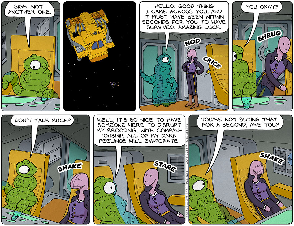 Hm. I get the impression that Diller is not the only lucky being around. This is twice now Alkyline has showed up in the presence of the humans to accomplish an amazing rescue. A nearly impossible to calculate impossible rescue, now repeated. Methinks there’s more to her than meets the eye…. which is, of course, given her semitransparent state, perfectly logical.