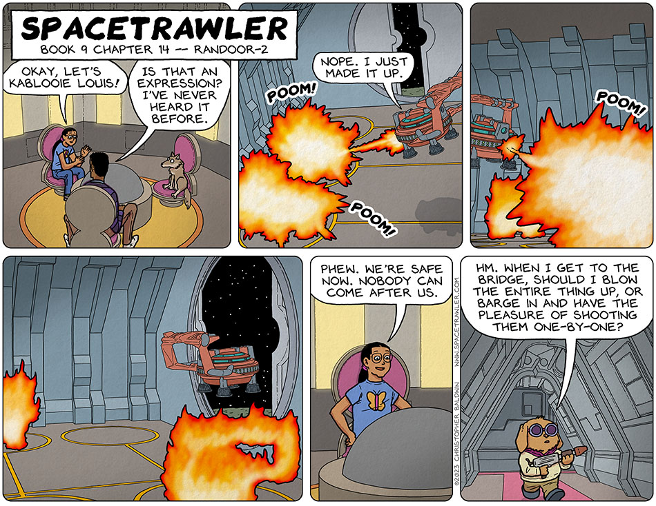 02/15/23 – Book 9 Chapter 14 – Randoor-2 Spacetrawler, audio version For the blind or visually impaired, February 15, 2023. https://www.baldwinpage.com/spacetrawler/wp-content/uploads/sites/15/2023/02/2023-02-15-audio-ST.mp3 Previous | Next 1st Series | 2nd Series | 3rd Series | First Strip Current Series | Archive | Most Recent Previous | Next 1st Series | 2nd Series | 3rd Series | First Strip Current Series | Archive | Most Recent Oh, the tension. 😉 First Strip First Series | First Strip Second Series | First Strip Current Series| Archive | Most Recent 02/13/23 – Kungoolean Nut Roll 02/17/23 – A Rarity 11 Comments Frith R February 15, 2023 at 12:35 am 3 years ago Is that coyote gun still working? Coming soon in yet another exciting episode of “SPACETRAWLER!” russell February 15, 2023 at 1:58 am 3 years ago It’s on stun now. But the coyote is no longer allergic, has no idea that he needs to sneeze. totematika February 15, 2023 at 2:25 am 3 years ago Isn’t the coyote allergic to these puppies? russell February 15, 2023 at 12:08 pm 3 years ago Got fixed. Coyoty February 15, 2023 at 3:22 am 3 years ago The expressions catch on… “Let’s kabang Kang!” “Let’s upside Darkseid!” “Let’s silence Science!” Sean K. February 15, 2023 at 10:55 pm 3 years ago “Let’s Poom Doom!” Keith February 15, 2023 at 7:05 am 3 years ago Kablooie lous. I like ti. Dr. Moosen McMoose, Chief Spymooster of the Moosad February 15, 2023 at 11:04 am 3 years ago Ah, yes, ’80s pop band Kablooie Louis and the Boom. TB February 15, 2023 at 3:27 pm 3 years ago Kablooie Louis is from a later adventure of the famous Hamster Huey. Pete Rogan February 15, 2023 at 8:13 pm 3 years ago Well, all right, tension mounts. But it’s not last-reel-of-‘Alien’ tension. It’s more like last-reel-of-‘Ghostbusters’ tension. I can see it becoming something like last-reel-of-‘Pulp Fiction’ tension, but I doubt you’d keep your PG rating with that. Dang, am I out of popcorn again? I need a jumbo Dr. Pepper for this one, too. Uh, after one brief quick pause. Coyoty February 16, 2023 at 3:47 am 3 years ago Kablooie Louis! Oh, oh, it’s the way we go… Leave a Reply Cancel reply Your email address will not be published. Required fields are marked *CommentName* Email* Website Notify me of follow-up comments by email. Notify me of new posts by email.
