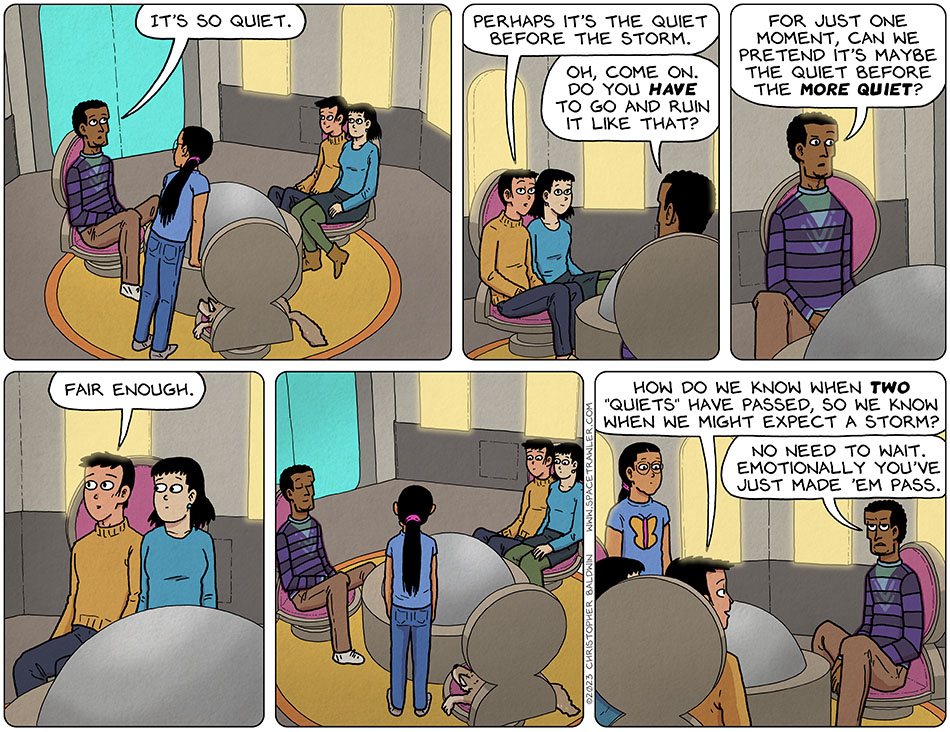 I sense that here. Which is why my fingers are still sinking more deeply into the chair arms. I’m too aware that the calm precedes not the storm, but the roof coming off in the wind. I hear the whistling now. And I’m succumbing to cringe fatigue.