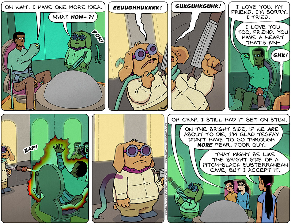 I’m trying not to be further irritated that the attempt allowed Science to check and alter the setting on his weapon. He might have just stunned them, dropped the shield and hauled them to the airlock, giving Aitana and company time to revive and provide at least a distraction for Tesfay and Chiphu on the counterattack. No chance now.
