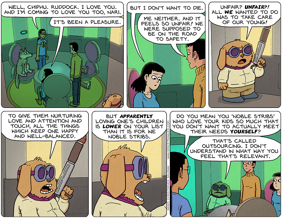 Correction to panel 3, ” All we wanted to do was to HAVE YOU take care of our young”.