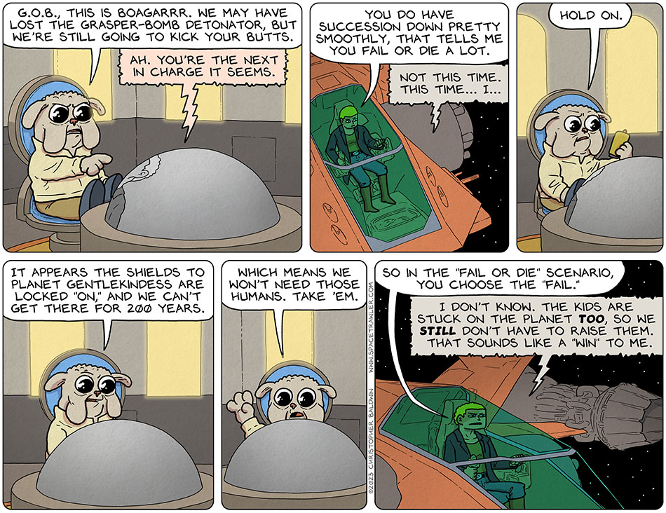 This entire arc is because the Stribs never learned to say “please,” isn’t it. ‘Cause I guarantee there are a LOT of humans who would love to take care of cute-looking puppy-dog-alien babies. Some of us are pretty good parents who can’t have kids.. pretty sure a few of them would be willing to help the Stribs for room and board.