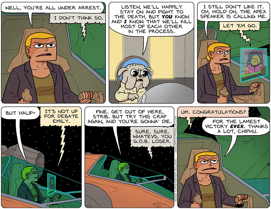 I kind of hope Halip has another card up her sleeve. I don’t know that she knows Gentlekindness has been walled off from the Galaxy, but I kind of hope she’s gotten an idea of what sort of parasitic cancer the Stribs are and is moving to have them removed from the Galaxy permanently. And not through the Drakk-Sim, either.