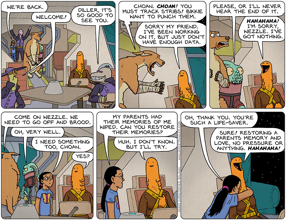 Just a thought. It came right after the realization that in terms of the people who mean the most to her, Aitana’s parents have already died. And Aitana is worse than dead to them, but just a stranger. I’m sick of seeing Martina’s relations punished for following her into space, willingly or no. I want Javier and Raquel restored to their real family, and Aitana as well. This first crime of the Stribs (minus the house-smashing) must be reversed.