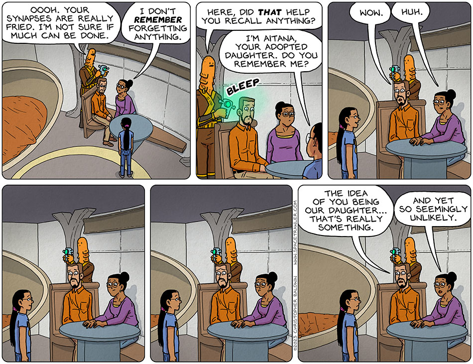 But here, we have another clue to progress. For the first time, we have six consecutive panels of Choan not smiling. Not once. That tells me she’s putting serious thought into this problem. So I ain’t worried. It’s just a matter of time. And trying some other things.