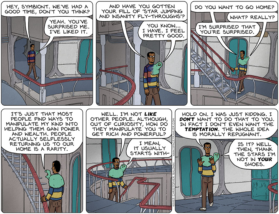 Given that he is now enormously rich and arguably powerful compared to the beginning of the story, bonus points if the symbiont was about to launch into a description of their first few conversations. 😉