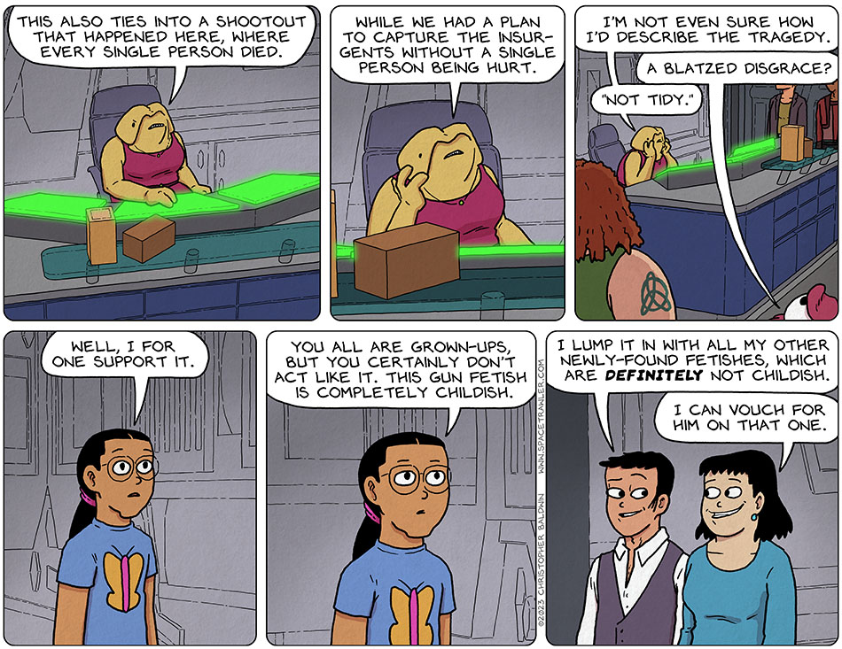 06/26/23 – Not Tidy Spacetrawler, audio version For the blind or visually impaired, June 26, 2023. https://www.baldwinpage.com/spacetrawler/wp-content/uploads/sites/15/2023/06/2023-06-26-audio-ST.mp3 Previous | Next 1st Series | 2nd Series | 3rd Series | First Strip Current Series | Archive | Most Recent Previous | Next 1st Series | 2nd Series | 3rd Series | First Strip Current Series | Archive | Most Recent Oh, Chiphu. You’ve grown up so fast. First Strip First Series | First Strip Second Series | First Strip Current Series| Archive | Most Recent 06/23/23 – New Gun Law 06/28/23 – Taking Good Care