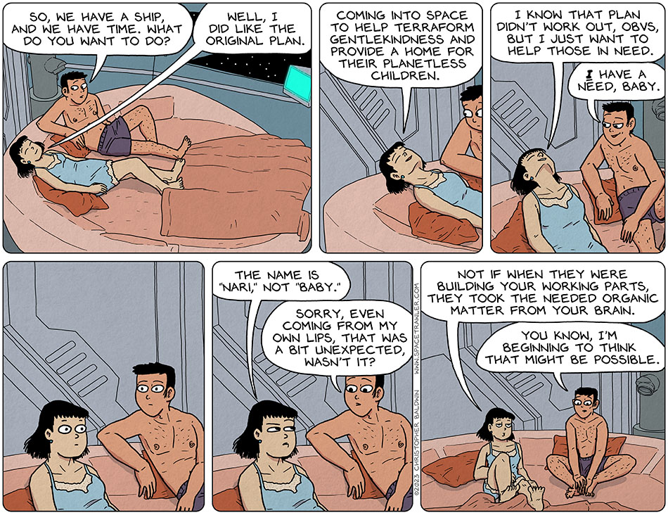 07/26/23 – Those In Need Spacetrawler, audio version For the blind or visually impaired, July 26, 2023. https://www.baldwinpage.com/spacetrawler/wp-content/uploads/sites/15/2023/07/2023-07-26-audio-ST.mp3 Previous | Next 1st Series | 2nd Series | 3rd Series | First Strip Current Series | Archive | Most Recent Previous | Next 1st Series | 2nd Series | 3rd Series | First Strip Current Series | Archive | Most Recent There are many forms of philanthropy. First Strip First Series | First Strip Second Series | First Strip Current Series| Archive | Most Recent 07/24/23 – Another Letter of Commendation 07/28/23 – Some Time Relaxing 9 Comments Efogoto July 26, 2023 at 12:16 am 2 years ago Had to! How else could he think with the little head? TheWreck July 26, 2023 at 12:22 am 2 years ago Hmmm. The first inkling of trouble in paradise! Coyoty July 26, 2023 at 1:48 am 2 years ago That would explain him thinking with his working parts. Smanger July 26, 2023 at 8:52 am 2 years ago Be careful what you wish for. Totematika July 26, 2023 at 5:30 pm 2 years ago These two should start gathering orphans around the galaxy, it would also be an awsm spin-off Pete Rogan July 26, 2023 at 9:53 pm 2 years ago There are many things to consider in giving of oneself. One of the most important is from which part of you it’s coming. No, not a play on words, but if YOU think so, hey. My gift to you. Zeebob Thoomquist III, Esquire July 27, 2023 at 7:27 pm 2 years ago Niiiiice. ???? ? that’s a smiley if the encoding screws it up. C.B.VINCENT July 27, 2023 at 3:20 am 2 years ago No colour contrast on Chiphu’s reconstructed nose. Marc July 31, 2023 at 5:59 pm 2 years ago As someone with experience with HRT, they don’t need to remove any of your brain. T will just shut it down for you. Leave a Reply Cancel reply Your email address will not be published. Required fields are marked *CommentName* Email* Website Notify me of follow-up comments by email. Notify me of new posts by email.