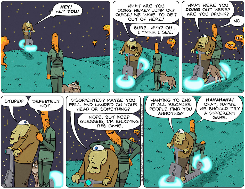 Yet Choan is able to rest her foot on the aft glowing torus with no apparent effect, ill or otherwise. Are physics that much different here? And if so, when will our adventurous duo get smacked in the crankcase by them?