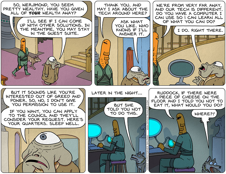 The question we must ponder, as readers, is: Was Werjimond wise enough to know Choan would violate her trust at first opportunity? Because if she did, then there’s something out there on the Bupillionet that Werjimond knows Choan cannot resist once seeing it, and this will compel her actions from that point forward.