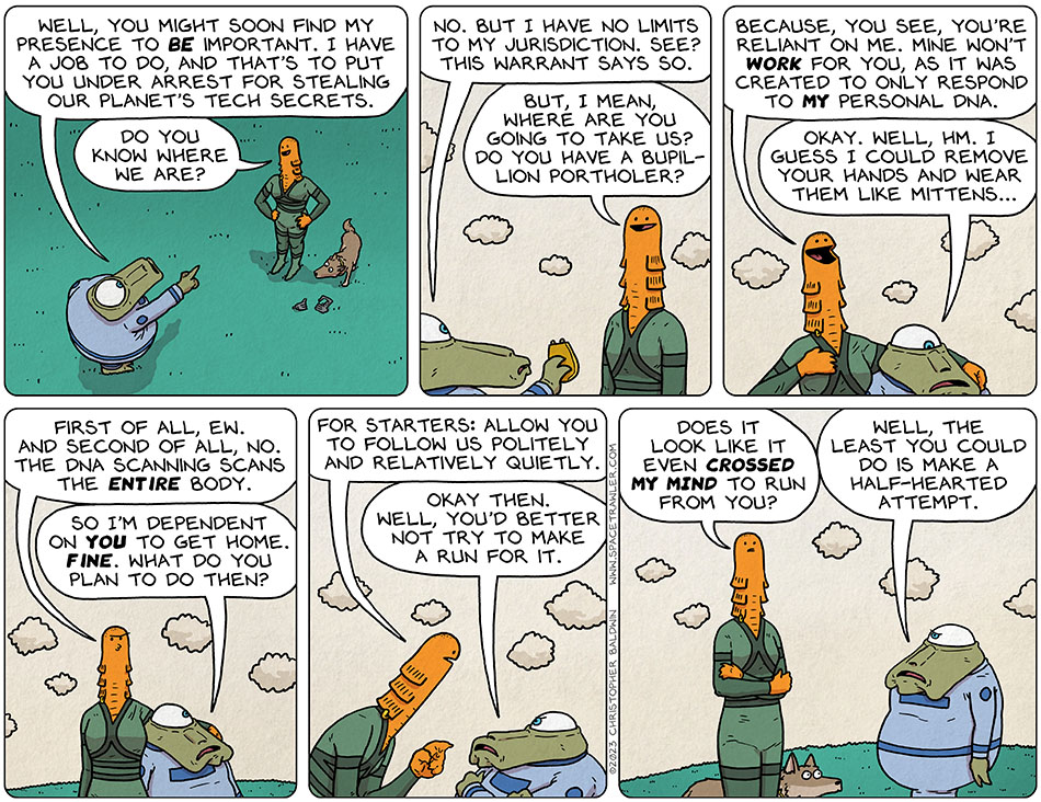 Just as a sidenote, this is the first open expression of power through superior technology Choan has allowed herself. She mocked Werjimond for her presumed weakness for wanting tech and the oney it brought, but didn’t try to strongarm her into anything. Poudric’s not so lucky. Unless he reaches for a new level of freedom himself and tells Choan to bugger off, potholer and all. But he’s bound by duty, you see.