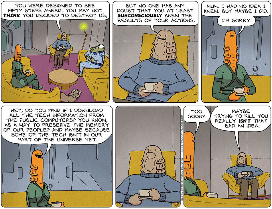 And, I mean, self doubt is the whole reason she’s taking this road trip to begin with. There are earlier foreshadowing remarks, but she starts to be explicit about it here: https://www.baldwinpage.com/spacetrawler/2023/08/11/081123-choan-calls-in/
