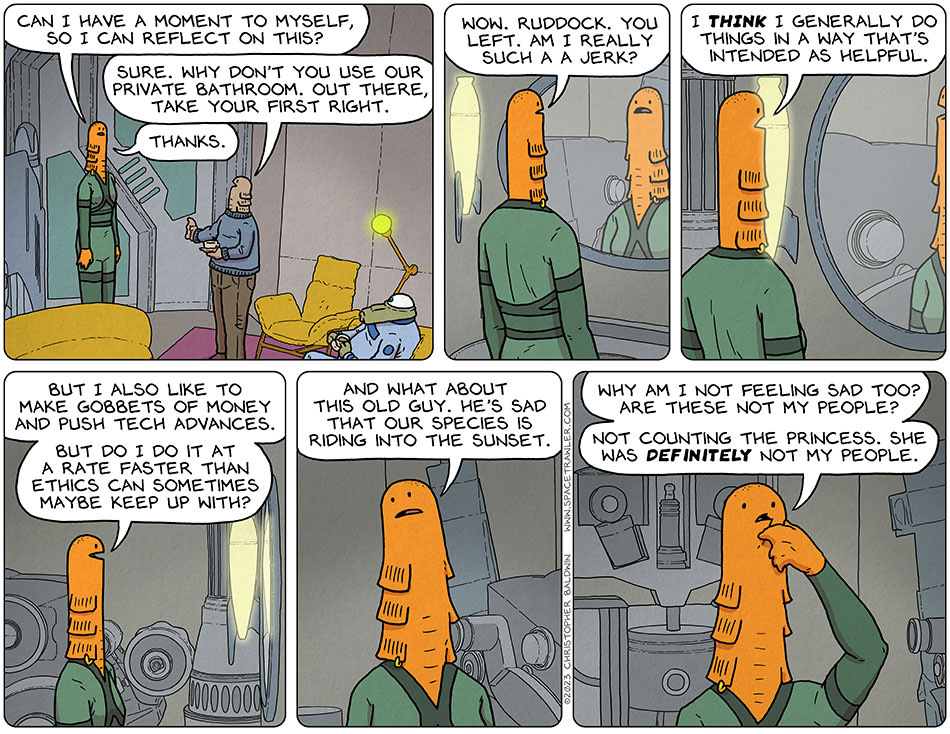 Considering the amount of slavery, genocide, mind control, and all-around bad stuff we’ve seen in this comic so far, it seems harsh to dump on Choan here just for lacking empathy. I get that the idea is getting her to use her intellect to save her civilization (and others), but “it’s your fault for not feeling bad enough about it to fix our problems for us” is a weird path to get there.