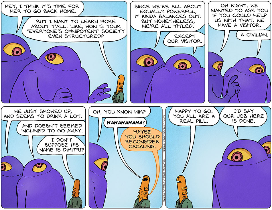 Dmitri seems to have picked up Choan’s taste for exotic other universes, something he manifested when he passed through the Drakk-Sim before locking it up. Strange kind of wanderlust, especially since he doesn’t have Choan’s taste for profit or he’d have taken his grandmother’s tea cookie recipe with him. Makes me think Bupillion booze must be something to write home about. Once one has finished drinking, that is, which means, for Dmitri, never.