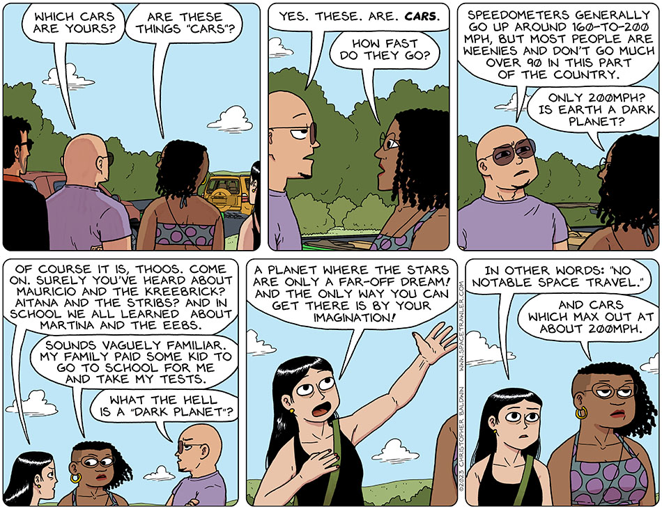 Rodrigo, Knox, Thoos, and Picknar left the hot spring pool area and walked up to the road where their cars were parked. Knox asked, “which cars are yours?” Thoos replied, “are these things ‘cars’?” Annoyed that Thoos didn’t know this basic fact, or was pretending not to, Fox said, “yes. these. are. cars.” Curious, Thoos said, “how fast do they go?” Getting pulled into the dining into his technical knowledge, Knox said, “speedometers generally go up around 160-to-200 mph, but most people are weenies and don’t go much over 90 in this part of the country.” Thoos asked, “only 200mph? Is earth a dark planet?” Now it was Picknar’s turn to get annoyed at Thoos, and they said, “of course it is, Thoos. Come on. surely you’ve heard about Mauricio and the Kreebrick? Aitana and the Stribs? And in school we all learned about Martina and the Eebs.” Thoos replied, “sounds vaguely familiar. My family paid some kid to go to school for me and take my tests.” Knox defensively said, “what the hell is a ‘dark planet’?” Speaking dramatically with an arm in the air, Picknar said, “a planet where the stars are only a far-off dream! And the only way you can get there is by your imagination!” And then Picknar added, “in other words: ‘no notable space travel.'” Thoos added dryly, “and cars which max out at about 200mph.”