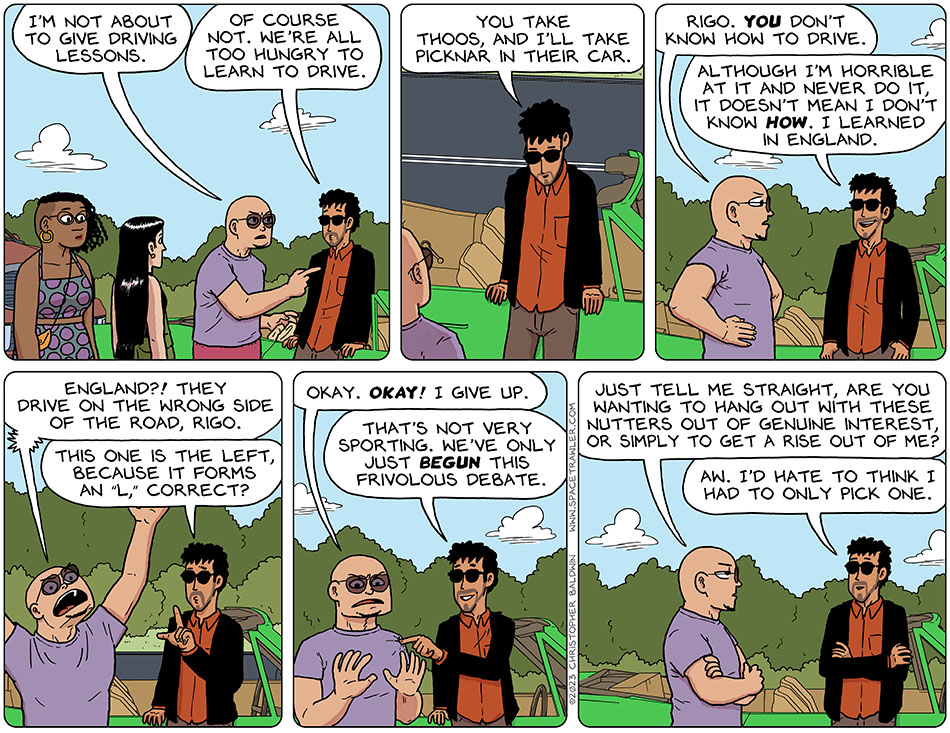 Knox wasn’t thrilled about how the plans were moving forward, and as he dropped their towels in the back of their car, he pointed his finger accusingly at Rodrigo and said, “I’m not about to give driving lessons.” Rodrigo leaned back against their car and said, “of course not. we’re all too hungry to learn to drive. You take Thoos, and I’ll take Picknar in their car.” Hands on his hips, Knox pointed out, “Rigo. you don’t know how to drive.” Smiling, Rodrigo replied, “although I’m horrible at it and never do it, it doesn’t mean I don’t know how. I learned in England.” Throwing his arms in the air, Knox said in exasperation, “England?! They drive on the wrong side of the road, Rigo.” Rodrigo lifted his left hand and formed an “L” with his fingers and innocently said, “this one is the left, because it forms an “L,” correct?” Knox said, “okay. Okay! I give up.” Smiling, Rodrigo said, “that’s not very sporting. We’ve only just begun this frivolous debate.” Crossing his arms, Knox said, “just tell me straight, are you wanting to hang out with these nutters out of genuine interest, or simply to get a rise out of me?” Crossing his arms in reply, Rodrigo said, “aw. I’d hate to think I had to only pick one.”