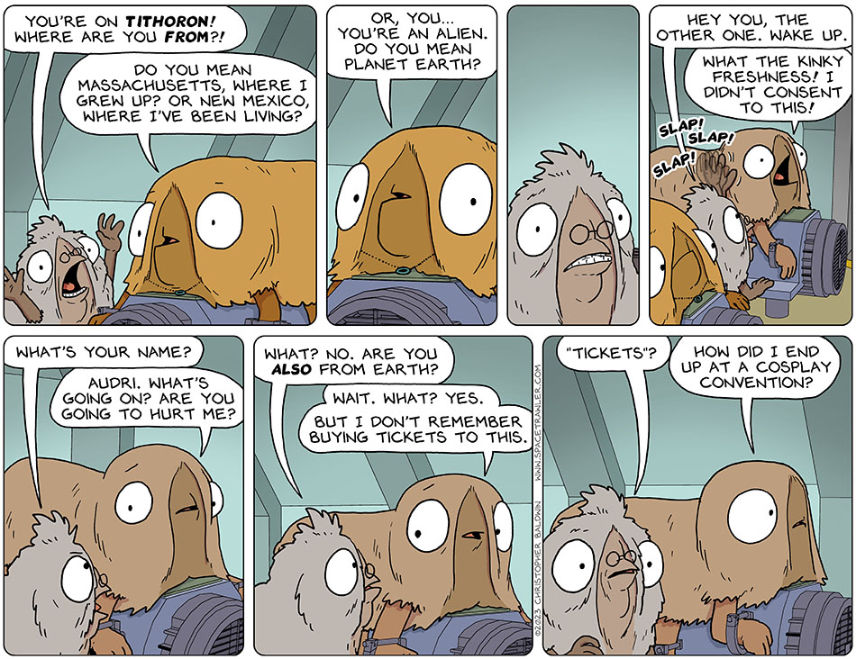 Throwing their arms in the air, Loomp yelled, “you’re on Tithoron! Where are you from?!” Val-in-Picknar’s-body said, “do you mean Massachusetts, where I grew up? Or new mexico, where I’ve been living? Or, you… you’re an alien. Do you mean planet earth?” Panicking, Loomp paused long enough to grit their teeth, and then went over to Thoos and began slapping them on the side of the head and said, “hey you, the other one. Wake up.” Startled awake, the body of Thoos said, “what the kinky freshness! I didn’t consent to this!” Loom asked sternly, “what’s your name?” Not sure what’s going on, Thoos’s body replied, “Audri. What’s going on? are you going to hurt me?” Yes, dear readers, Audri was also switched, but into Thoos’s body. Loomp said, “what? no. Are you also from earth?” Audri said, “wait. what? yes. But I don’t remember buying tickets to this.” Loomp asked, “‘tickets’?” Audri said “how did I end up at a cosplay convention?”