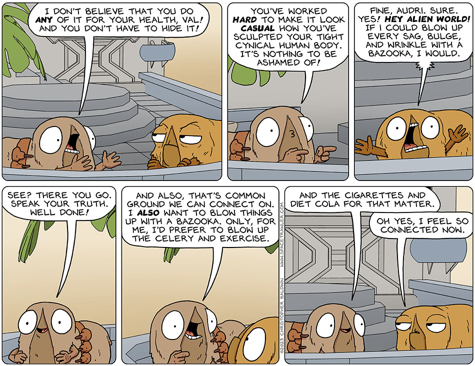 Audri continued yelling, “I don’t believe that you do any of it for your health, Val! And you don’t have to hide it! You’ve worked hard to make it look casual how you’ve sculpted your tight cynical human body. It’s nothing to be ashamed of!” Finally Val flew off the handle and shouter out to the city, “fine, Audri. Sure. Yes! Hey alien world! If i could blow up every sag, bulge, and wrinkle with a bazooka, I would.” Smiling and calm now, Audri said, “see? There you go. Speak your truth. Well done! And also, that’s common ground we can connect on. I also want to blow things up with a bazooka. Only, for me, I’d prefer to blow up the celery and exercise. And the cigarettes and diet cola for that matter.” Unimpressed, Val said, “oh yes, I feel so connected now.”