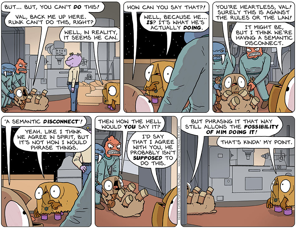 Being dragged away by two guards, Audri said to Runk and Val, “but… but, you can’t do this! Val, back me up here. Runk can’t do this, right?” Val, a straight shooter, said, “well, in reality, it seems he can.” Confused, Audri said, “how can you say that?!” Trying to explain, Val said, “well, because he… is? It’s what he’s actually doing.” Horrified, Audri said, “you’re heartless, Val! Surely this is against the rules or the law!” Not knowing galactic law, Val said, “it might be, but I think we’re having a semantic disconnect.” Audri yelled, “‘a semantic disconnect’!” Val said, “yeah. Like I think we agree in spirit, but it’s not how I would phrase things.” Getting pissed off, Audri said, “then how the hell would you say it?” Val replied, “I’d say that I agree with you, he probably isn’t supposed to do this.” Panicked as she was being dragged out of the room, Audri said, “but phrasing it that way still allows the possibility of him doing it!” Val said, “that’s kinda’ my point.”