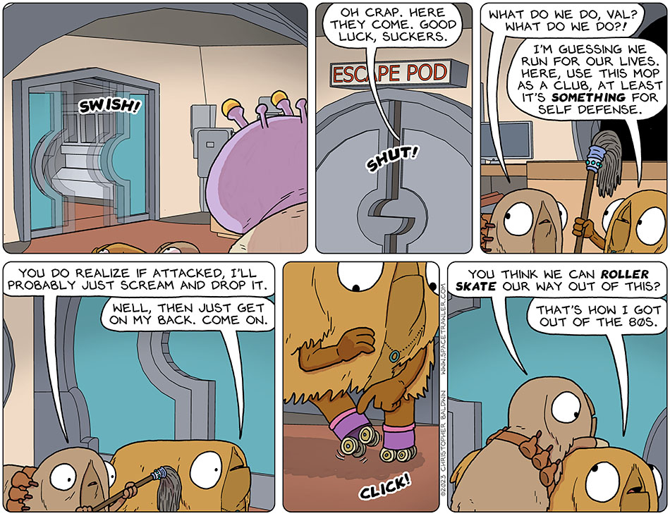 As Runk watches from halfway inside the escape pod, they all turn and see the door from thuebridge to the hallway open with a swish! Runk shuts the escape pod door, with him inside, saying to Audri and Val, “oh crap. Here they come. good luck, suckers.” Audri says, “what do we do, Val? What do we do?!” Val hands her a mop and says, “I’m guessing we run for our lives. Here, use this mop as a club, at least it’s something for self defense.” Taking the mop, Audri says, “you do realize if attacked, i’ll probably just scream and drop it.” Val says, “Well, then just get on my back. Come on.” Val then releases the wheels from her roller skating shoes. Audri starts climbing onto her back and says, “you think we can roller skate our way out of this?” Val says, “that’s how I got out of the 80s.”