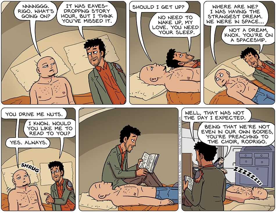 In the cell-bedroom, Knox awoke, to find that Rodrigo was already awake and laying beside him. Knox said, “nnnnggg. Rigo. what’s going on?” Rodrigo smiled at him and said, “it was eavesdropping story hour, but I think you’ve missed it.” Knox asked, “should I get up?” Rodrigo said, “no need to wake up, my love. You need your sleep.” Knox looked at the room and said, “where are we? I was having the strangest dream. Ee were in space…” Rodrigo smiled and said, “not a dream, Knox. You’re on a spaceship.” Knox gave up and said, “you drive me nuts.” Rodrigo asked him, “I know. Would you like me to read to you?” Knox shrugged and said, “yes. Always.” Knox shut his eyes as Rodrigo read to him. Eventually, Knox fell asleep. Rodrigo observed, “well, that was not the day I expected.” Across the room, Picknar said, “being that we’re not even in our own bodies, you’re preaching to the choir, Rodrigo.”