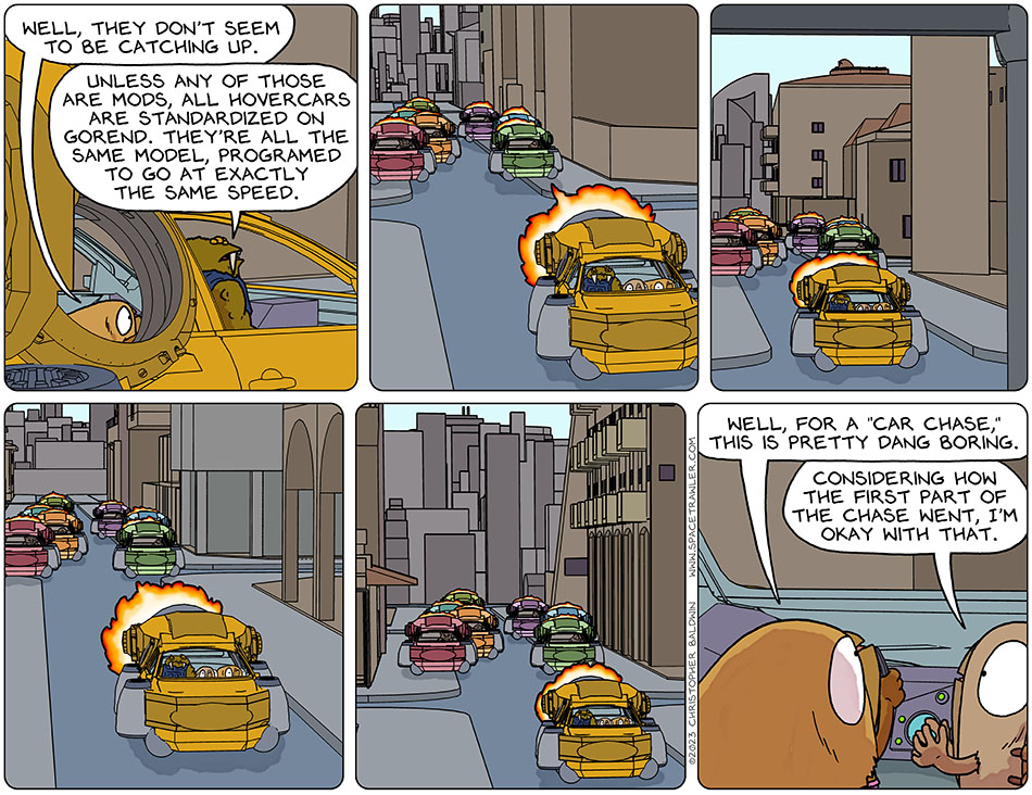 Still driving the hovercar, with a group of seven hovercars chasing them, Val said, “Well, they don’t seem to be catching up.” Gerek said, “Unless any of those are mods, all hovercars are standardized on Gorend. They’re all the same model, programed to go at exactly the same speed.” They chase proceeds on through the city, with no one gaining on anybody. Val said, “Well, for a ‘car chase,’ this is pretty dang boring.” Audri said, “Considering how the first part of the chase went, I’m okay with that.”