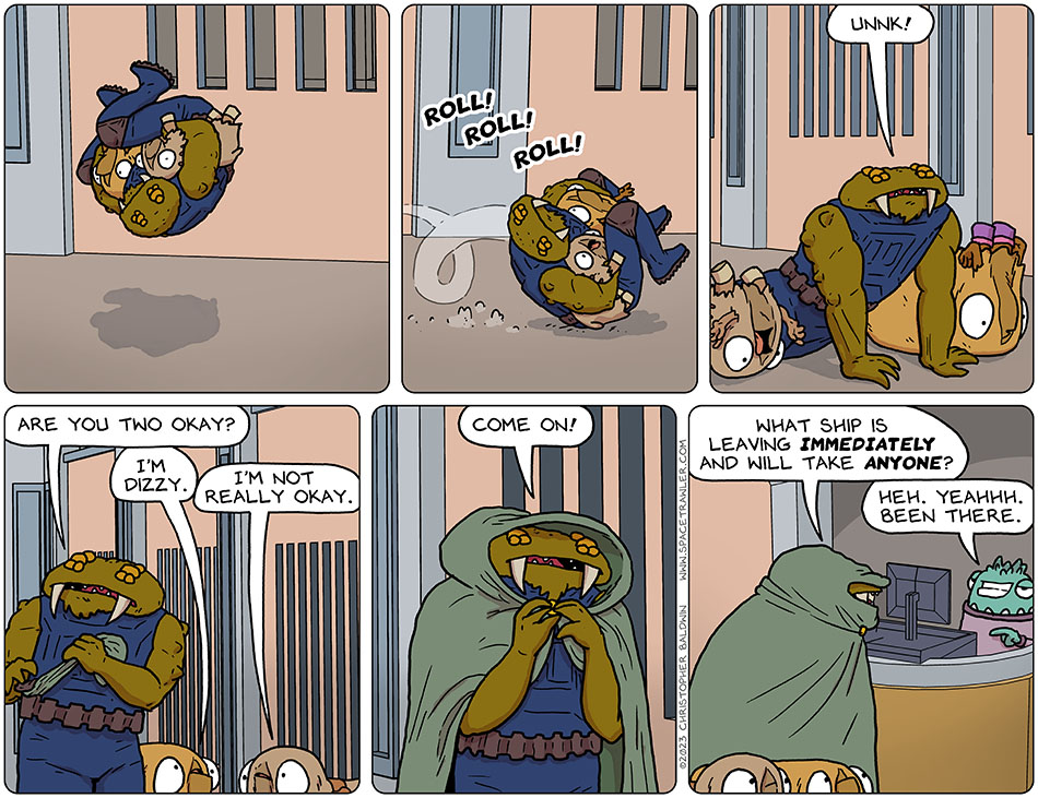 Gerek hurtled through the air, Val and Audri under his arms, and then hit the ground rolling. Coming to a stop, he pushed himself up, saying “Unnk! Are you two okay?” Val said, “I’m dizzy.” Audri said, “I’m not really okay.” Pulling a cloak out of his belt and putting it on, Gerek said, “Come on!” At Spaceport information, Gerek asked, “What ship is leaving immediately and will take anyone?” Grinning the Portmaster said, “Heh. Yeahhh. Been there.”