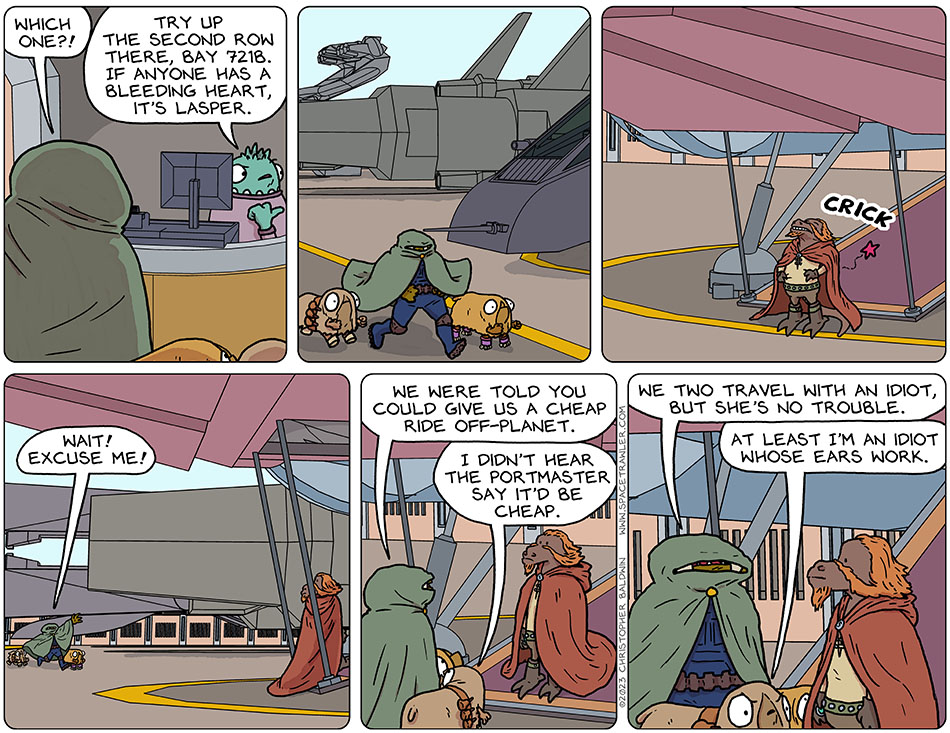 Needing to know which ship would be leaving immediately, Gerek asked the Portmaster, “Which one?!” The Portmaster said, “Try up the second row there, bay 721B. If anyone has a bleeding heart, it’s Lasper.” Gerek and Audri ran and Val rollerskated towards the ship, outside of which Lasper was stretching his back out with a “crick” before going on board. Running up, Gerek said, “Wait! Excuse me! We were told you could give us a cheap ride off-planet.” Audri said, “I didn’t hear the Portmaster say it’d be cheap.” Gerek said, “We two travel with an idiot, but she’s no trouble.” Audri said, “At least I’m an idiot whose ears work.”