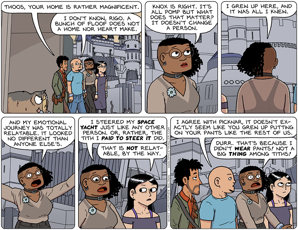 Walking out of the security ship landing area, a sprawling mansion unfolded to their view. Rodrigo said, “Thoos, your home is rather magnificent.” Knox said, “I don’t know, Rigo. A bunch of floof does not a home nor heart make.” Thoos said, “Knox is right. It’s all pomp but what does that matter? It doesn’t change a person. I grew up here, and it was all i knew. And my emotional journey was totally relatable. It looked no different than anyone else’s. I steered my space yacht just like any other person. Or, rather, the Tith I paid to steer it did.” Picknar said, “That is not relatable, by the way.” Knox said, “I agree with Picknar, it doesn’t exactly seem like you grew up putting on your pants like the rest of us.” Annoyed, Thoos said, “Durr. That’s because I didn’t wear pants! not a big thing among tiths!”