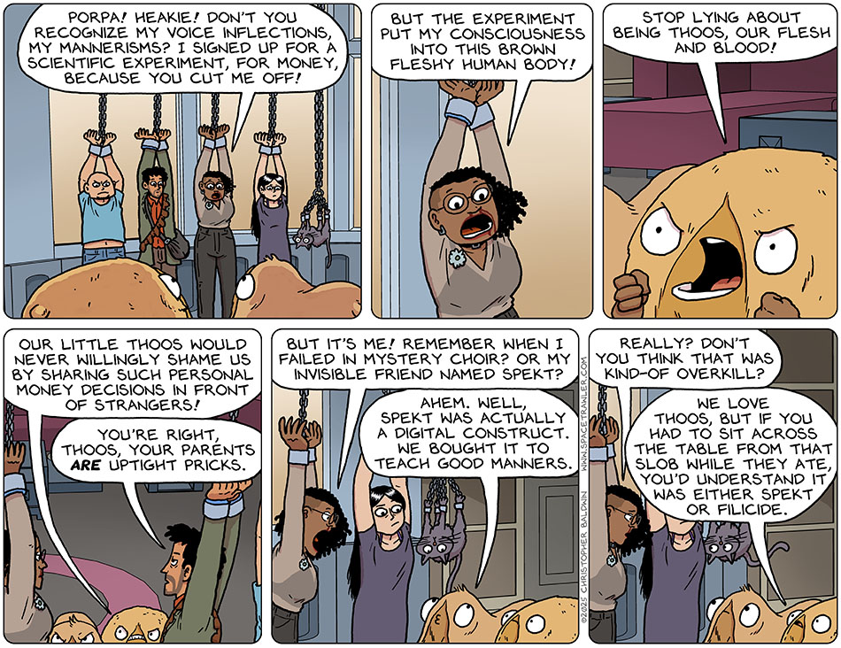 Still with their arms held above their heads by chains, Thoos said, “Porpa! Heakie! Don’t you recognize my voice inflections, my mannerisms? I signed up for a scientific experiment, for money, because you cut me off! But the experiment put my consciousness into this brown fleshy human body!” Porpa said, “Stop lying about being Thoos, our flesh and blood! Our little Thoos would never willingly shame us by sharing such personal money decisions in front of strangers!” Rodrigo commented to Thoos, “You’re right, Thoos, your parents are uptight pricks.” Thoos pled more, “But it’s me! Remember when I failed in mystery choir? Or my invisible friend named Spekt?” Looking slightly sheepish, Heakie said, “Ahem. well, Spekt was actually a digital construct. We bought it to teach good manners.” Thoos said, “Really? Don’t you think that was kind-of overkill?” Porpa replied, “We love Thoos, but if you had to sit across the table from that slob while they ate, you’d understand it was either Spekt or filicide.”
