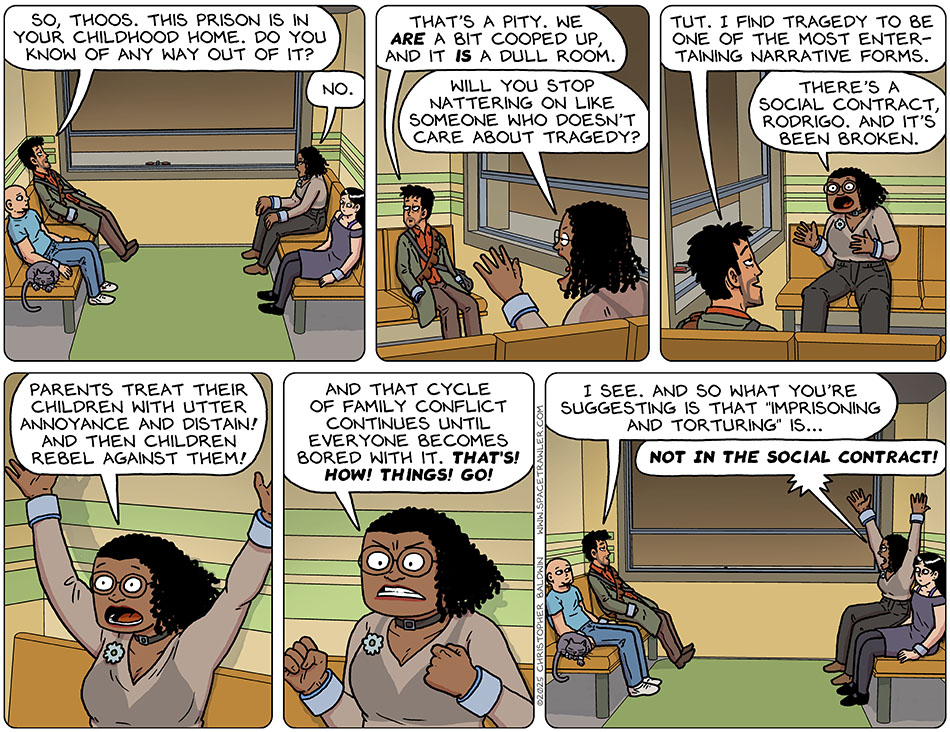 In the Sandwich Cell, Rodrigo said, “So, Thoos. This prison is in your childhood home. Do you know of any way out of it?” Thoos said, “No.” Looking around, Rodrigo said, “That’s a pity. We are a bit cooped up and it is a dull room.” Thoos yelled at him, “Will you stop nattering on like someone who doesn’t care about tragedy?” Rodrigo said, “Tut. I find tragedy to be one of the most entertaining narrative forms.” Upset now, Thoos said, “There’s a social contract, Rodrigo. And it’s been broken. Parents treat their children with utter annoyance and distain! And then children rebel against them! And that cycle of family conflict continues until everyone becomes bored with it. That’s! How! Things! Go!” Rodrigo said, “I see. And so what you’re suggesting is that imprisoning and torturing is…” Thoos yelled, “Not in the social contract!”