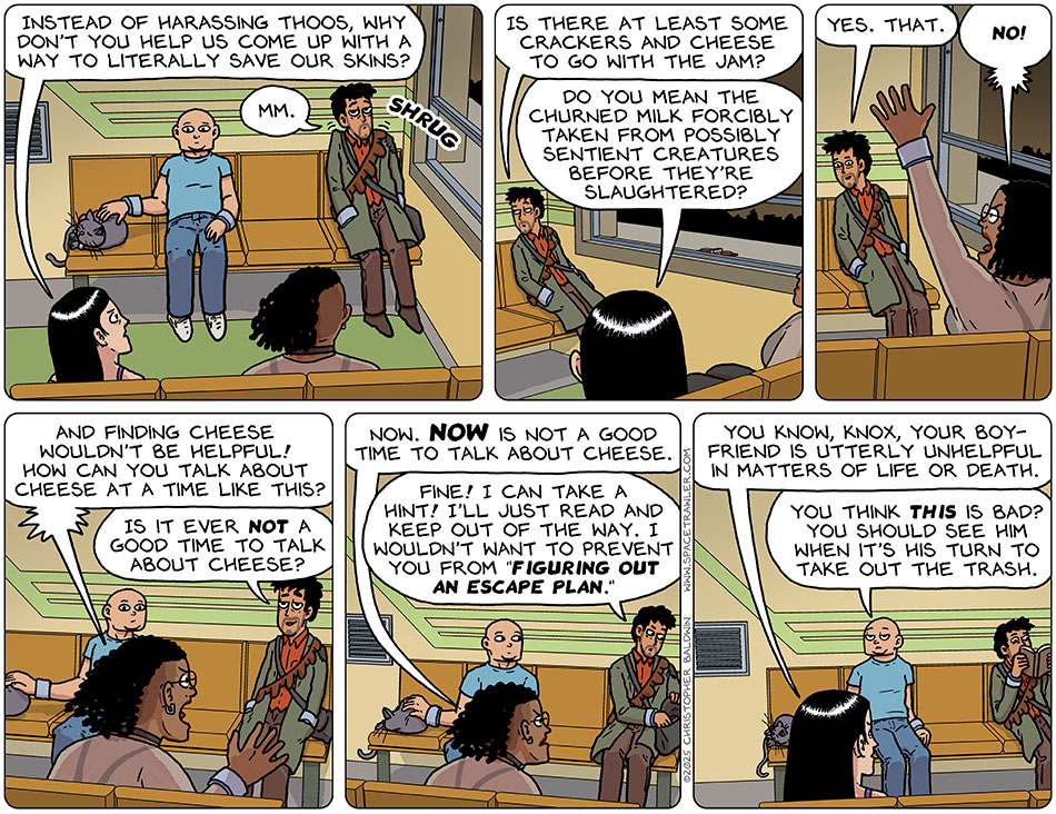 Still in the sandwich cell, Picknar said to Rodrigo, “Instead of harassing Thoos, why don’t you help us come up with a way to literally save our skins?” Rodrigo shrugged and disinterestedly said, “mm,” and then asked, “Is there at least some crackers and cheese to go with the jam?” Picknar asked, “Do you mean the churned milk forcibly taken from possibly sentient creatures before they’re slaughtered?” Rodrigo said, “Yes. That.” Then Thoos began yelling, “No! And finding cheese wouldn’t be helpful! How can you talk about cheese at a time like this?” Rodrigo said, “Is it ever not a good time to talk about cheese?” Fuming, Thoos said, “Now. Now is not a good time to talk about cheese.” Annoyed, Rodrigo started rummaging through his bag for a book and said, “Fine! I can take a hint! I’ll just read and keep out of the way. I wouldn’t want to prevent you from ‘figuring out an escape plan.'” Picknar said, “You know, Knox, your boyfriend is utterly unhelpful in matters of life or death.” Knox said, “You think this is bad? You should see him when it’s his turn to take out the trash.”