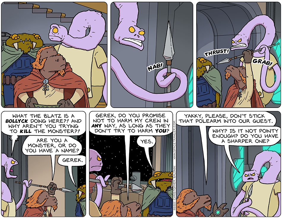 Wide-eyed, Yakky sees there is a Bollyck on board, grabs a spear, and thrusts it at Gerek, but Lasper reaches up and grabs in in mid-thrust, stopping it from puncturing. Yakky yelled, “What the blatz is a Bollyck doing here?! And why aren’t you trying to kill the monster?!” Lasper asked Gerek, “Are you a monster, or do you have a name?” Gerek said, “Gerek.” Lasper then asked him, “Gerek, do you promise not to harm my crew in any way, as long as they don’t try to harm you?” Gerek said, “Yes.” Lasper turned to Yakky and said, “Yakky, please, don’t stick that polearm into our guest.” Yakky looked at the spear and said, “Why? Is it not pointy enough? Do you have a sharper one?”