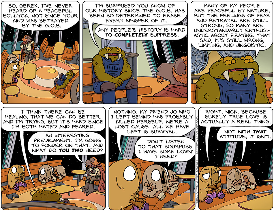 In the upstairs lounge on the ship, Val, Audri, Lasper, and Gerek sat. Lasper said, "So, Gerek, I've never heard of a peaceful Bollyck, not since your kind was betrayed by the G.O.B." Gerek said, "I'm surprised you know of our history since the G.O.B. has been so determined to erase every whisper of it." Lasper replied, "Any people's history is hard to completely suppress." Gerek said, "Many of my people are peaceful by nature, but the feelings of fear and betrayal are still strong, so many are understandably enthusiastic about pirating. That said, it's still wrong, limiting, and jingoistic. I think there can be healing, that we can do better. And I'm trying, but it's hard since I'm both hated and feared." Lasper said, "An interesting predicament. I'm going to ponder on that." Lasper then said to Val and Audri, "And what do you two need?" Val said, "Nothing. My friend Jo who I left behind has probably killed herself. We're a lost cause. All we have left is survival." Audri pointed her finger at Val and yelled, "Don't listen to that sourpuss. I have some lovin' I need!" Val looked aside, grumpy and sarcastic, and said, "Right. Nick. Because surely true love is actually a real thing." Audri crossed her arms and closed her eyes and stuck her nose in the air and said, "Not with that attitude, it isn't."
