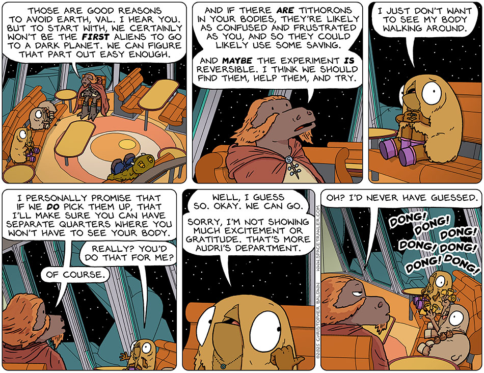 With Lasper, Val, Audri and Gerek still in this ship lounge, Lasper said to Val, “those are good reasons to avoid earth, Val. I hear you. But to start with, we certainly won’t be the first aliens to go to a dark planet. We can figure that part out easy enough. And if there are Tithorons in your bodies, they’re likely as confused and frustrated as you, and so they could likely use some saving. And maybe the experiment is reversible. I think we should find them, help them, and try.” Looking worried and upset, Val said, “I just don’t want to see my body walking around.” Lasper reassured her, “I personally promise that if we do pick them up, that i’ll make sure you can have separate quarters where you won’t have to see your body.” Val asked, “Really? You’d do that for me?” Lasper said, “of course.” Val said, “Well, I guess so. Okay. We can go. Sorry, I’m not showing much excitement or gratitude. That’s more audri’s department.” Audri pointed at Audri with her thumb, while Audri madly played her handbells, DONG! DONG! DONG! DONG! DONG! Lasper said sarcastically, “Oh? I’d never have guessed.”