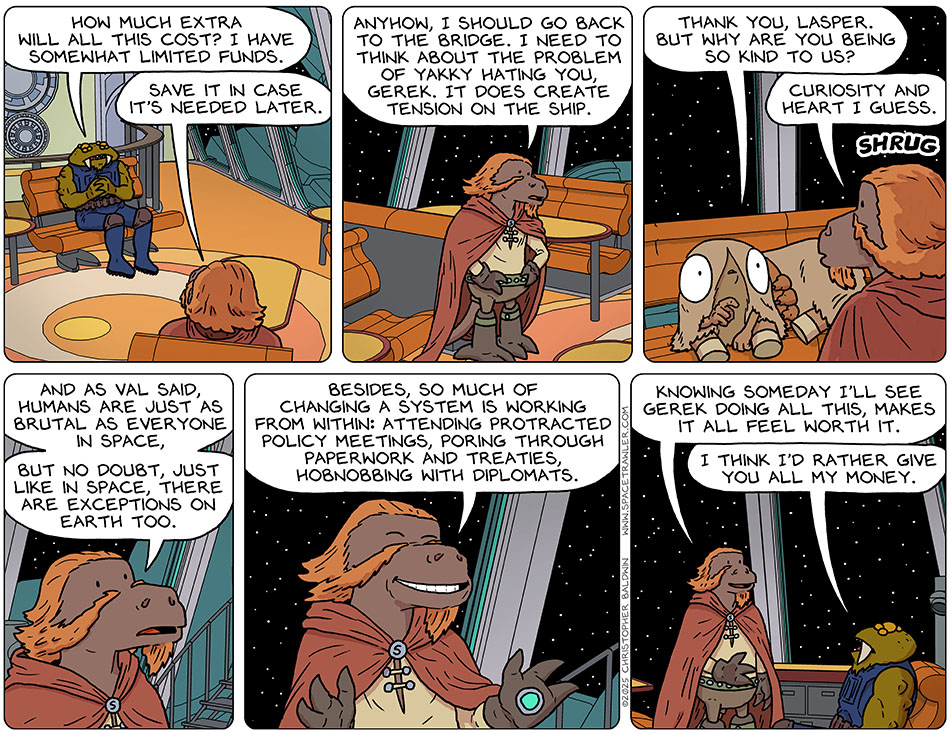 Gerek asked Lasper, "How much extra will all this cost? I have somewhat limited funds." Lasper reassured him, "Save it in case it's needed later." Lasper then stood up and said, "Anyhow, I should go back to the bridge. I need to think about the problem of Yakky hating you, Gerek. It does create tension on the ship." Audri said, "thank you, Lasper. But why are you being so kind to us?" Lasper shrugged and said, "curiosity and heart I guess. And as Val said, humans are just as brutal as everyone in space, but no doubt, just like in space, there are exceptions on earth too." Lasper then spread his arms and grinned kindly and said, "Besides, so much of changing a system is working from within: attending protracted policy meetings, poring through paperwork and treaties, hobnobbing with diplomats. Knowing someday I'll see Gerek doing all this, makes it all feel worth it." Gerek, not liking the sound of any of that, said, "I think i'd rather give you all my money."