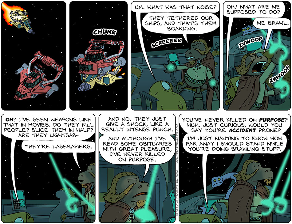 The ship chasing Lasper's ship drew nearer, and then attached itself with a "Chunk!" Val asked Lasper, "Um. What was that noise?" Getting up Lasper's palms began to glow. He gritted his teeth and said, "They tethered our ships." There was a screeching sound of doors being forcefully opened. Lasper said, "And that's them boarding." Val said, "Oh! what are we supposed to do?" Glowing rapiers appeared in Lasper's hands, somehow being formed from the glowing circles on his palms. He declared, "We brawl." Val said, "Oh! I've seen weapons like that in movies. Do they kill people? Slice them in half? Are they lightsab-" Lasper interrupted her and said, "They're laserapiers. And no. They just give a shock, like a really intense punch. And although I've read some obituaries with great pleasure, I've never killed on purpose." Feeling unsure about this, Val said, "You've never killed on purpose? Huh. Just curious, would you say you're accident prone? I'm just wanting to know how far away I should stand while you're doing brawling stuff."