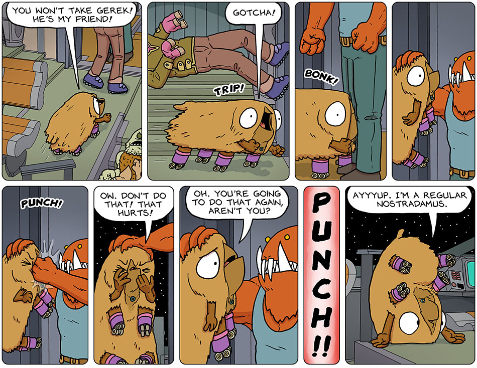 Val started rolling fast at one of the aliens and she said, “You won’t take Gerek! He’s my friend!” And then she rolled into the alien and knocked it off its feet as she said, “Gotcha!” Then she ran into another alien, who picked her up with its clawed hands and punched her in the face. She squinted in pain and said, “Ow. Don’t do that! That hurts!” And then she looked at him and said mournfully, “Oh. You’re going to do that again, aren’t you?” And the alien punched her so hard she flew across the room and landed on her head, where she said, “Ayyyup. I’m a regular Nostradamus.”