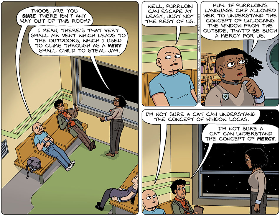 Back in the Jam cell in Thoos’s family home, Knox said, “Thoos, are you sure there isn’t any way out of this room?” Thoos pointed to a vent and replied, “I mean, there’s that very small air vent which leads to the outdoors, which I used to climb through as a very small child to steal jam.” Knox looked at Purrloin and said, “Well, Purrloin can escape at least, just not the rest of us.” Thoos said, “Huh. if Purrloin’s language chip allowed her to understand the concept of unlocking the window from the outside, that’d be such a mercy for us.” Knox said, “I’m not sure a cat can understand the concept of window locks.” Rodrigo added, “I’m not sure a cat can understand the concept of mercy.”