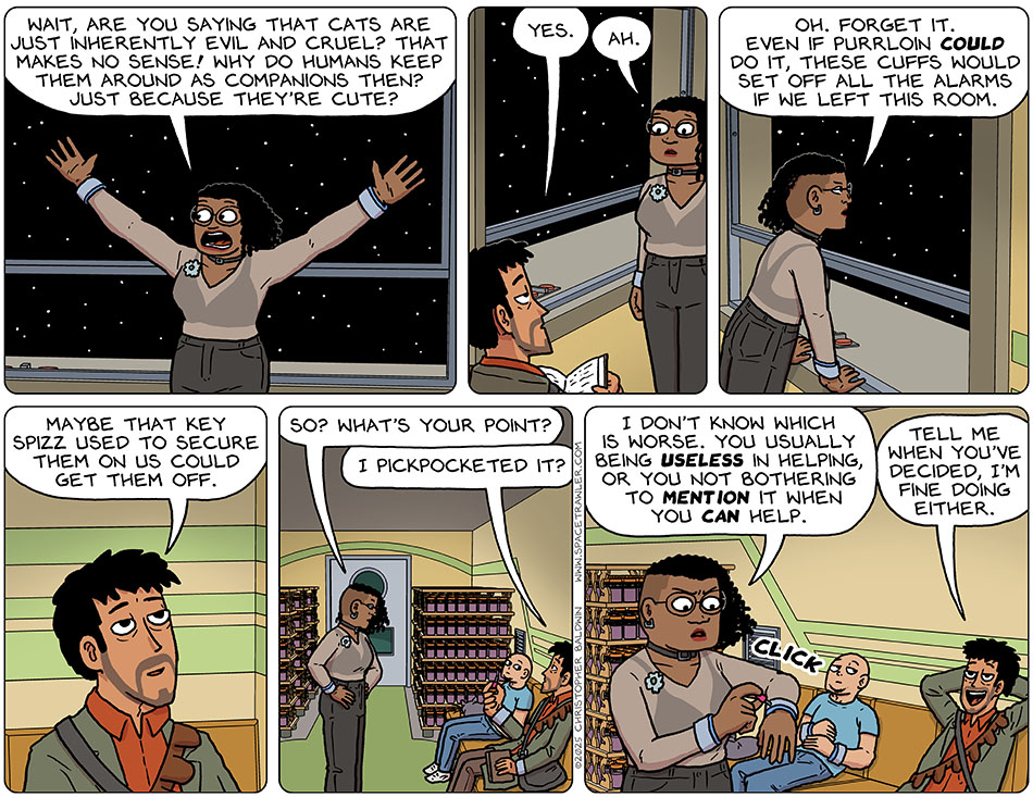 If curious, in the last panel of this strip, as Spizz put the cuff-key into his fur for storage, who was in close had his arm around Spizz? Rodrigo, the little thief! (this is not a detail that is important or has a clearly guessable intent at the time, but just to let you know I do try to think of these things)