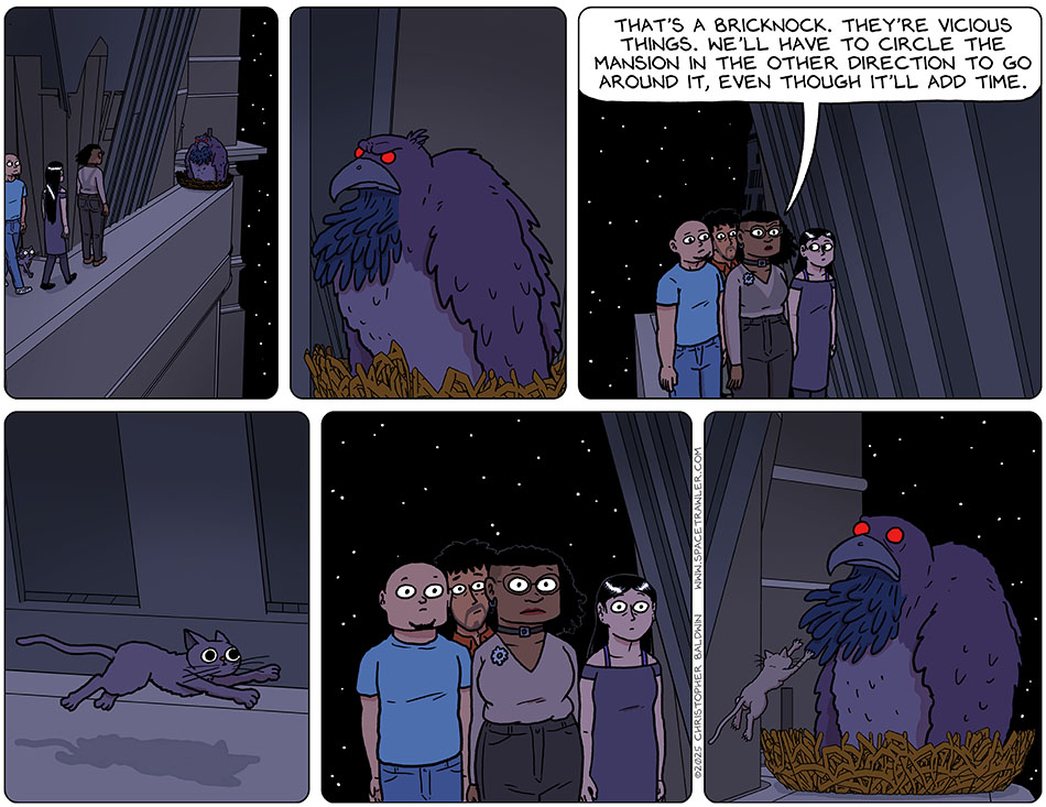 Ahead of them perched a bird in a nest. A bird bigger than any of them, viscous looking, red glowing eyes, and sitting in a nest. Thoos said, “That’s a Bricknock. They’re vicious things. We’ll have to circle the mansion in the other direction to go around it, even though it’ll add time.” Then Purrloin ran forth and jumps at the Bricknock as the rest of them stared on wide-eyed.