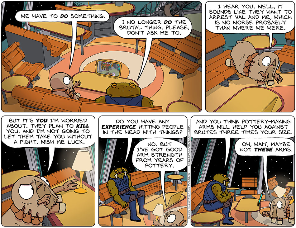 From a screen in the ship’s lounge, Audri and Gerek watched the end of the fracas on the bridge, and Audri said, “We have to do something.” Gerek said, “I no longer do the brutal thing. Please, don’t ask me to.” Audri got off the couch, went to a counter-top, grabbed a lamp, and said, “I hear you. well, it sounds like they want to arrest val and me, which is no worse probably than where we were. But it’s you i’m worried about. They plan to kill you. And I’m not going to let them take you without a fight. Wish me luck.” Unimpressed by her chances, Gerek said, “Do you have any experience hitting people in the head with things?” Audri said, “No. But I’ve got good arm strength from years of pottery.” Gerek sat forward and crossed his arms and said, “And you think pottery-making arms will help you against brutes three times your size.” Looking at her Tith arms, Audri said, “Oh, wait, maybe not these arms.”