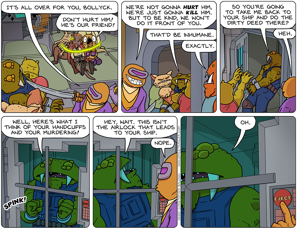 The mob managed to get Gerek restrained and cuffed, and one of them took charge as second in command and said, “It’s all over for you, Bollyck.” Picknar yelled, “Don’t hurt him! He’s our friend!” Grinning, second-in-command said, “We’re not gonna hurt him, we’re just gonna kill him. But to be kind, we won’t do it front of you.” Gerek said sarcastically, “That’d be inhumane.” Justice chimed in, “Exactly.” They dragged Gerek off and threw him into an airlock. Gerek said, “So you’re going to take me back ?? your ship and do the dirty deed there?” Second-in-command just laughed. Gerek pulled his handcuffs apart and said, “Well, here’s what i think of your handcuffs and your murdering!” Then he looked around him and said, “Hey, wait. this isn’t the airlock that leads to your ship.” Second-in-Command said, “Nope.” And as second-in-command pressed the “eject” button, Gerek said, “oh.”